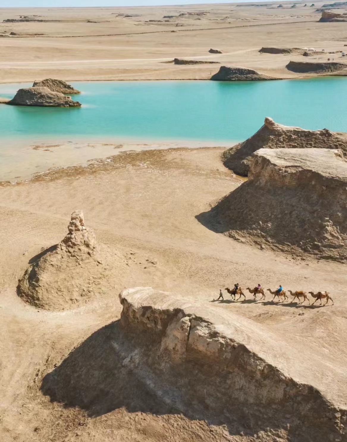 早餐后,乘车赴【乌素特水上雅丹地质公园】(含景区首道大门票,不含区间车,游览时间约120分钟)是一处水上雅丹的特色地质地貌,因为吉乃尔湖面抬升,逐步淹没北缘的雅丹群,形成了独特的水上雅丹,魔幻而神秘。目前去过的人很少,景区面积也非常大,不必担心拥挤情况,你可以尽情欣赏,慢慢游览。景区内从朝霞满天到日暮垂落都如梦似幻,阳光照在水上雅丹上,颜色金黄,石柱和倒影感觉升到了半空中,像悬浮的魔幻城堡。之后(车览)【东台吉乃尔湖】山与水的融合,着实壮丽!不同的季节造就不同的美丽,魅如蓝,黯如灰,换个角度看,是不是有种万佛朝宗的感觉!非常震撼!眼前的景象让我想起了春天河流化冰,冰排一呼而下的壮观景象,这里看上去更似百舸争流,千帆竞渡!后乘车前往大柴旦,途径【U型公路】(途经车览)公路沿昆仑山脉脚下的塔克拉玛干沙漠边沿延伸,跨过罗布泊,翻过阿尔金山,穿越柴达木盆地,绕过青海湖。像一条黑丝带,串起沙漠、戈壁、盐碱滩、咸水湖等奇特自然风光,一路风光如画,美不胜收。【红崖火星地貌景观区】(游览约20分钟)红崖,这片位于青海省海西州大柴旦行政委员会驻地柴旦镇南侧约38公里处的神秘之地,是一处由彩色土丘、丹霞和雅丹混合而成的耳廓形地貌。站在红崖的山谷之上,仿佛置身于火星,那大片蔓延的红色让人惊叹不已。后抵达格尔木入住酒店休息。