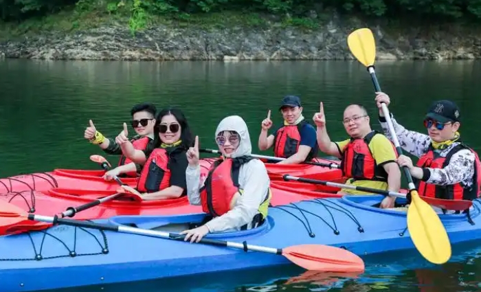 09:00-11:00 千岛湖【快乐皮划艇】(约2小时),体验千岛湖最佳的旅行方式之一就是在湖面泛舟。游客有机会与湖水亲密接触,在皮划艇上轻轻划桨,还能看到碧绿的湖面随你的动作荡起涟漪。湖面泛舟不但可以见证碧绿清澈的千岛湖水、还可以饱览长短不一的峡湾沟壑。除此之外,大家还能在湖中嗨水、划船,与小伙伴们一起进行跳艇,抓尾巴,竞速等好玩的团建游戏。驾一叶扁舟,与千岛湖亲密接触,享受慢节奏度假生活。