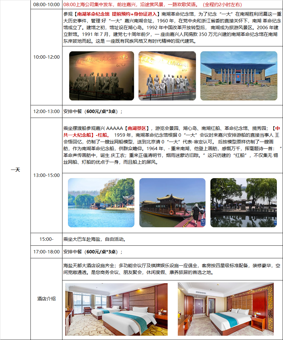 - 住宿:入住海盐天都大酒店四星级;