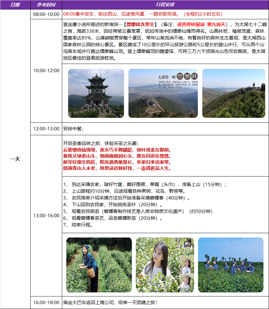 ★线路特色:全程2小时车程,欣赏太湖山水风光; ★景点特色:西山精华景点-缥缈峰/林屋洞、碧螺春采摘、品茶等休闲之旅;