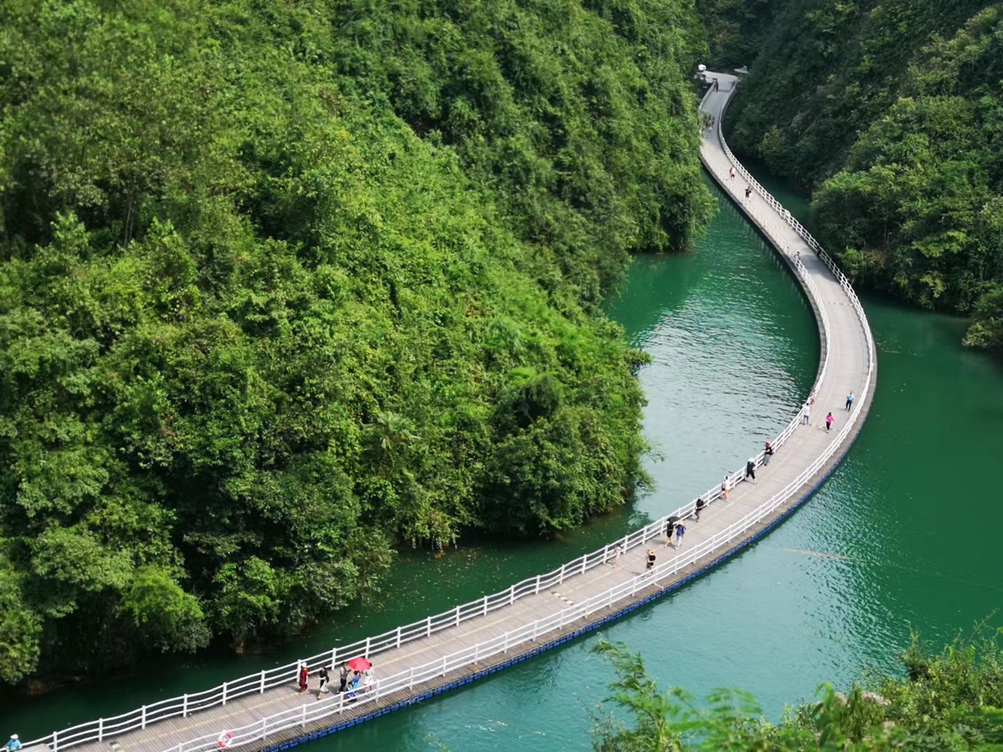 早餐后,乘车前往宣恩县【狮子关】(车程约1.5小时,游玩时间约2-3小时)狮子关有大小岩山五座,山形状似狮子,所以叫狮子关。景区大门后几百米,就下到了水上栈道(俗称浮桥)的中段的高处,也是拍摄浮桥全景的地方。我没有像其他游客那样乘坐旅游车,直接沿公路到了水上栈道的另一端,然后再下到浮桥。从此地俯瞰下去,整条河流呈现出一道半圆弧+S形走向,就像镶嵌在两座山峰之中的绿宝石,弯弯曲曲地伸向远方,最后消失在视线之外,狮子关的四周都是峡谷,干峡谷风光带和水峡谷风光带,把景区一分为二,森林、流水,形态万千的洞穴,碧绿的水面倒影着山谷,像是一面明镜。为了去摸这一江绿水,真的是太舒服了,整个景点设计的蛮用心。