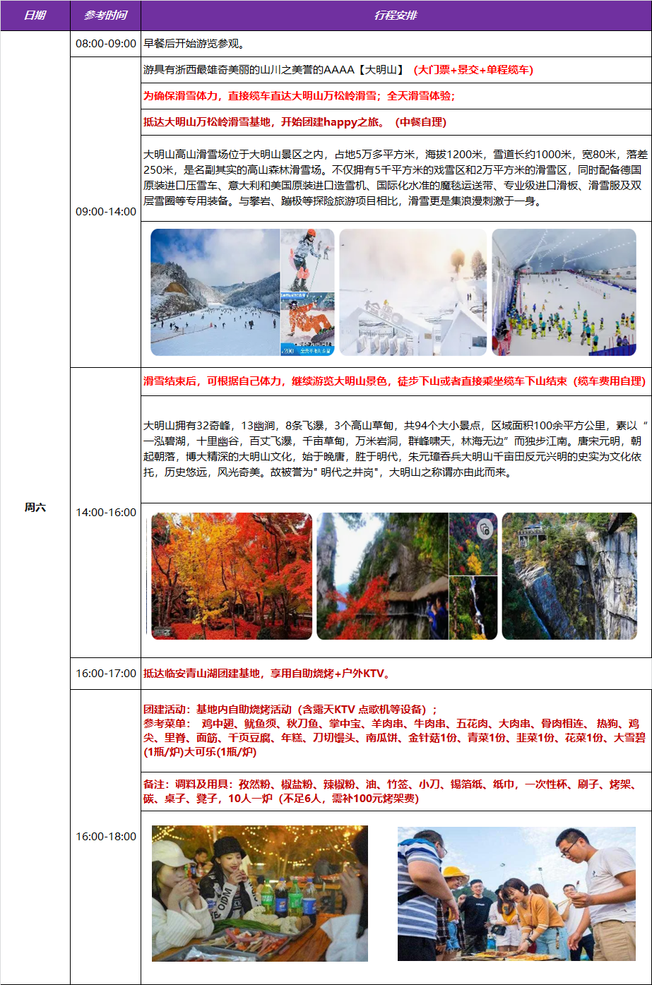 1、活动主题:“峰聚大明山,心聚团队魂” 在云雾缭绕的群山之巅,用脚步丈量自然的壮美;在协作挑战中激发潜能,用汗水书写团队的成长篇章!" 2、星空夜话,深度联结 自助烧烤,畅聊心声;即兴才艺秀、团队故事会,在笑声与感动中拉近彼此距离。 " 3、赴一场冬日之约,在雪地里撒点野。雪场集结,快乐加倍!这波团建,主打一个 “滑” 向自由!雪落无声,快乐有形,团建的意义就是和一群有趣的人同行。