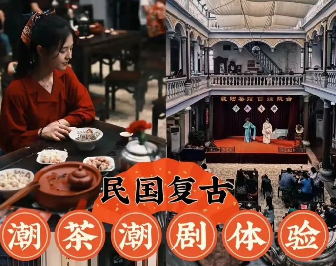 【观潮楼】(潮剧+喝茶+醒狮表演+英歌舞表演)(约50分钟):馆内多场演出,深入了解潮汕文化,安排英歌舞表演观赏,醒狮表演秀,非遗潮剧文化演出,更有潮汕工夫茶文化体验,英歌舞起源于明朝 已有三四百年历史。该舞蹈主题具有浓厚的水浒色彩多以模仿梁山泊水浒一百零八好汉为 主融合了戏剧 舞蹈 武术于一体是傩文化遗存的沿革与演变。