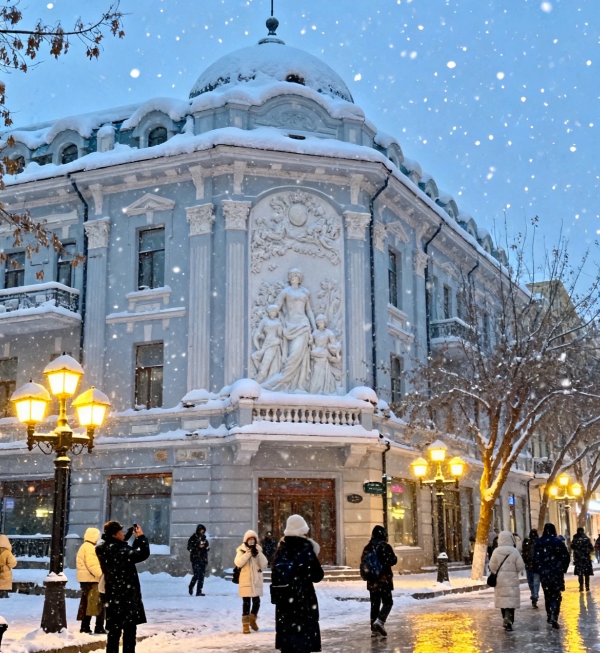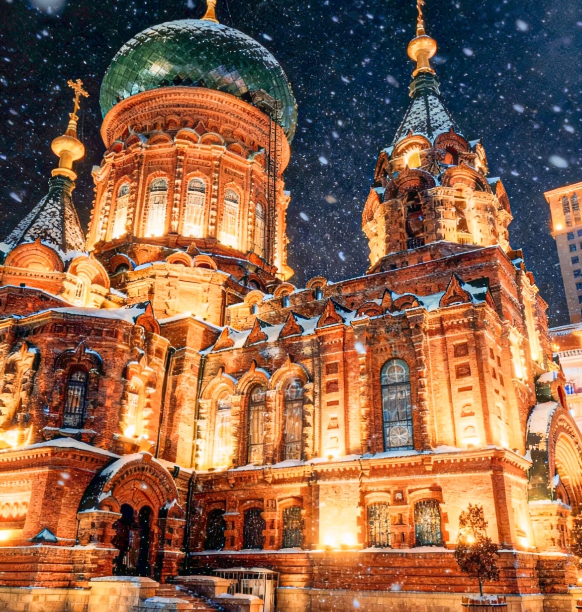 【圣.索菲亚教堂广场】,索菲亚教堂始建于1907年3月,原是沙俄修建中东铁路的随军教堂,占地面积721平方米,通高53.35米,平面呈拉丁十字布局,是典型的拜占庭风格建筑。