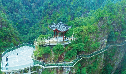 走入大门,蜿蜒而上,穿过天桥和天梯,抵达最高峰-天师殿。后挑战玻璃栈道,深不见底的万丈深渊,让您胆战心惊。