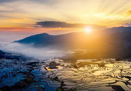 抵达元阳梯田我们前往梯田阶梯极多的坝达梯田等待拍摄【坝达梯田】日落,坝达梯田层层叠叠的壮阔,随着太阳的西斜,落日余辉与田埂线条,随着暮色逐渐褪去,变幻出绮丽的色彩。当晚我们安排入住元阳梯田核心景区,方便次日观赏拍摄壮观的梯田日出。