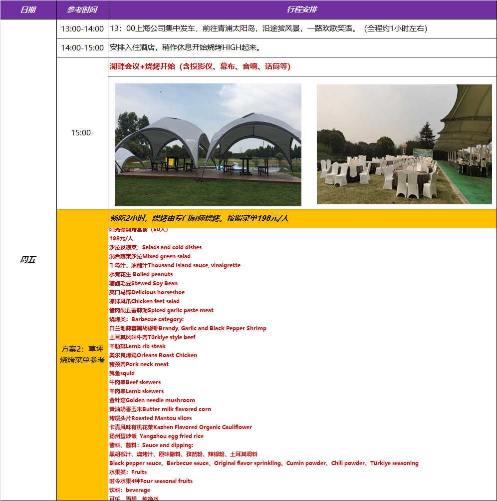 - 餐饮:全程1早1自助烧烤(畅吃2小时)+1中餐餐标800元/桌;含一烧烤畅吃畅饮;