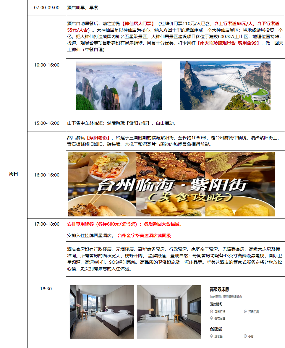 住宿:台州神仙居希尔顿逸林酒店或同级
