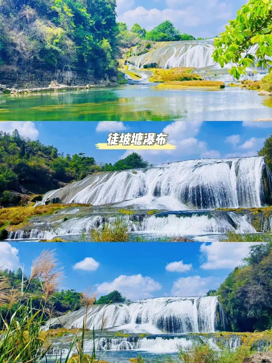 下午:游览【陡坡塘瀑布】(游览不少于1H),是黄果树瀑布群中瀑顶最宽的瀑布,瀑布形成百米多长的钙化滩坝上,在平水期,水流清澈,瀑布显得十分清秀妩媚,水层沿着和缓瀑面均匀的散开,在粼粼的钙化滩面上轻盈的舞动,如一层薄薄的半透明的面纱,又如一面面张开的素绢扇面在阳光下泛着银光。1986年版【西游记】片尾曲里面取景地。游览结束后乘车前往酒店,入住酒店休息!