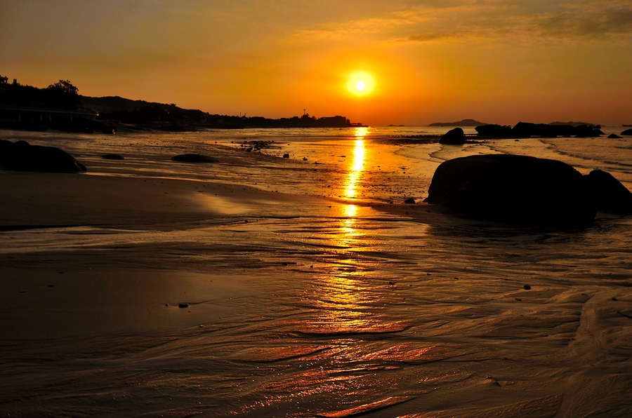 南音桥上,看音乐广场海域沙滩,平坦开阔。由于沙滩铺上了很多鹅卵石,海水一回一落,那种海水与一堆石头摩擦产生的哗啦啦声,极其美妙。一天,一地,一海,一人,一椅,一路灯,在这里,面向大海,静静聆听大海的呼吸。在音乐广场上的日出和日落,从绚丽化为淡然,由七彩归于苍茫,已倾尽一天爱的余晖,无阻的洒向海面。涨潮的关系,海水吞没了沙滩,裸露出来的都是光滑的鹅卵石,大大小小,形形色色!在这里随心的散散步,走走停停,享受下椰树棕榈树与大海的融合,没有丝毫的匆忙,自在的玩玩石头,听听街头艺人的弹唱,感觉日子挺美好!