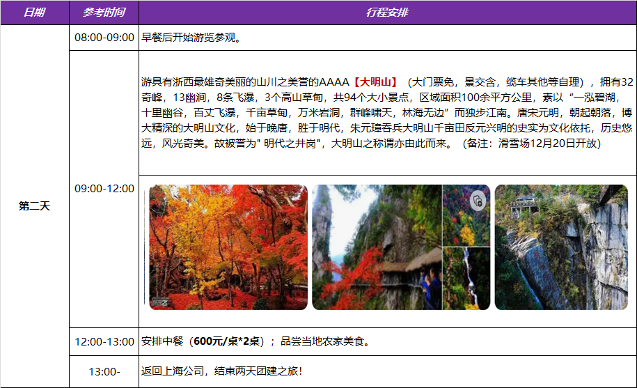 1、活动主题:“峰聚大明山,心聚团队魂” 在云雾缭绕的群山之巅,用脚步丈量自然的壮美;在协作挑战中激发潜能,用汗水书写团队的成长篇章! 2、星空夜话,深度联结 自助烧烤,畅聊心声;即兴才艺秀、团队故事会,在笑声与感动中拉近彼此距离。 3、赴一场冬日之约,在雪地里撒点野。雪场集结,快乐加倍!这波团建,主打一个 “滑” 向自由!雪落无声,快乐有形,团建的意义就是和一群有趣的人同行。