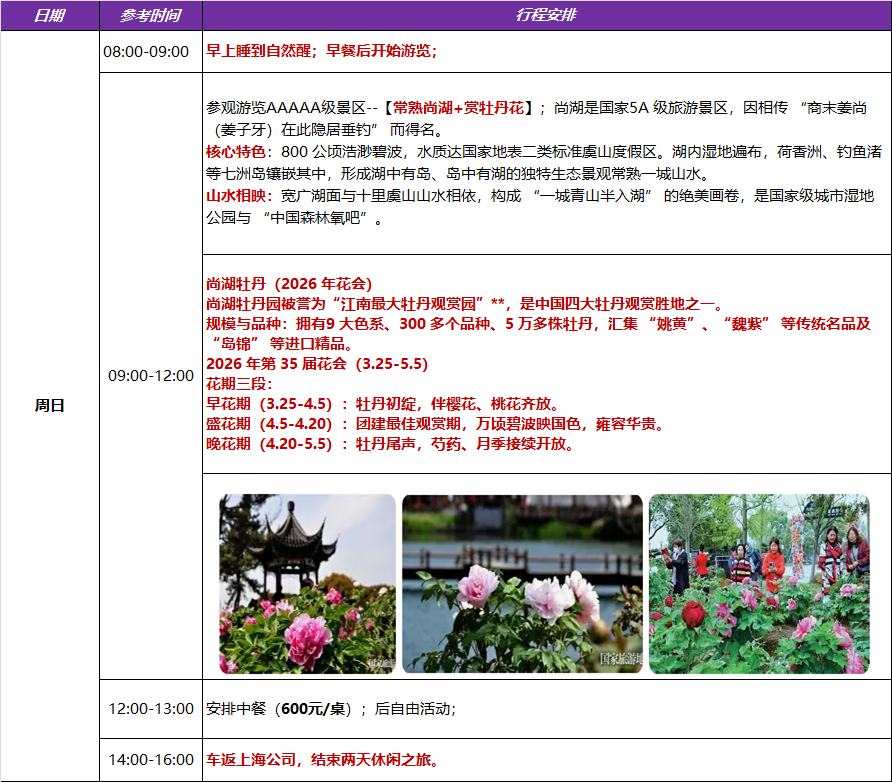 ★线路特色:全程1.5-2小时车程、精华景点、吃货之旅;本次团建走进常熟虞山 + 尚湖,徒步森林吸氧、赏万亩牡丹、品江南风味,在一山一湖一花海中放松身心、凝聚团队。行程轻松不累、风景出片、体验丰富,是春日最适合全员参与的休闲团建。 ★团建特色: ✅ 虞山徒步:国家森林公园,休闲步道轻松走,吸氧解压、团队同行; ✅ 尚湖赏牡丹:万亩牡丹盛放,江南顶流花海,拍照氛围感拉满;"