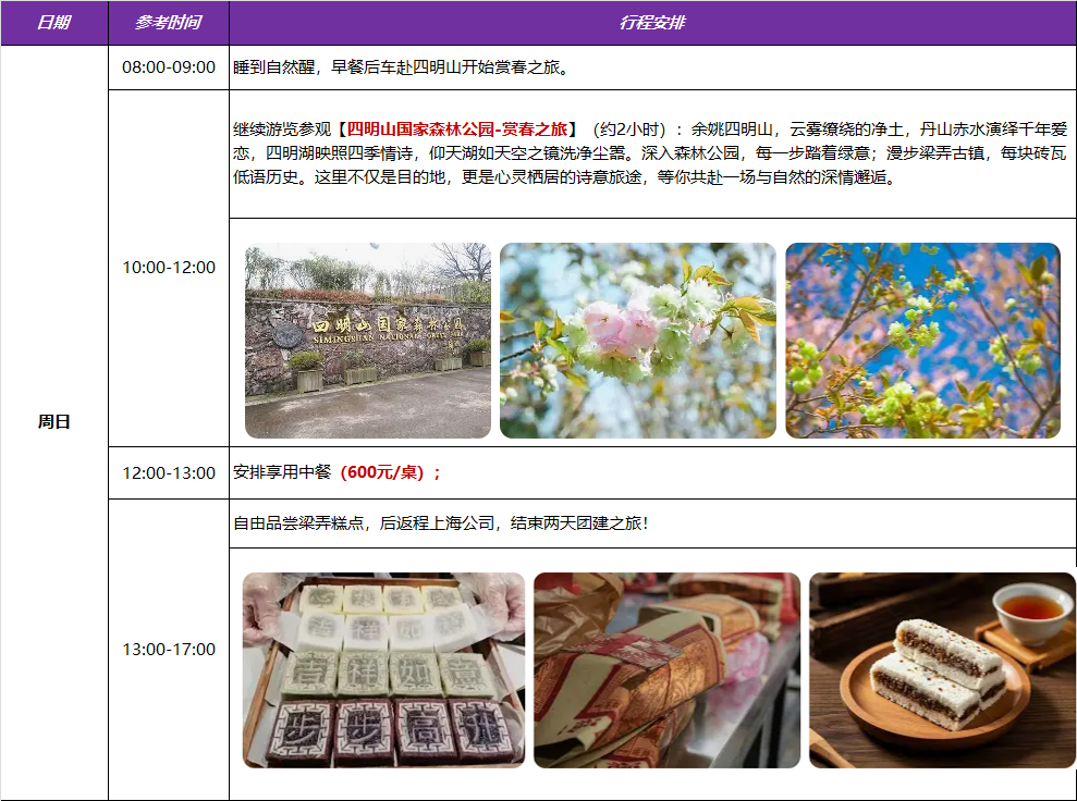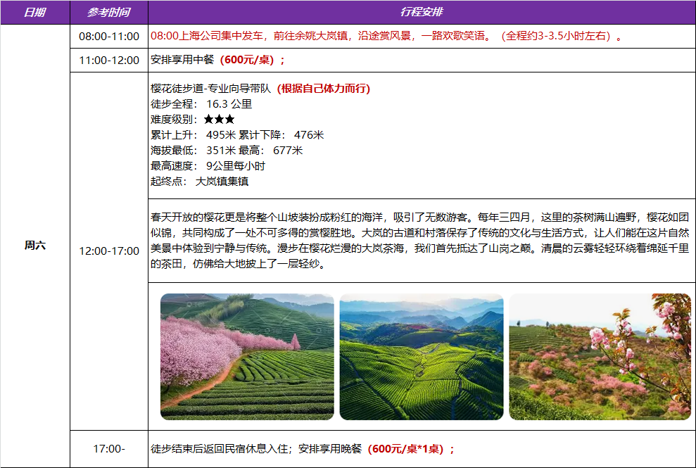 🌸快乐团建・大岚樱花徒步|赴一场四明山春日之约,徒步赏樱,并肩同行,把工作交给默契,把风景留给彼此。 🌿春日限定|大岚万亩樱花盛放,四明山吸氧徒步,两天一夜纯玩团建,治愈疲惫,聚力前行。 ✨樱你而聚・向山而行|告别工位,奔赴山野,樱花为伴,团队同心,这趟春游,快乐满分! 春风拂面,樱漫山野,正是团建好时节!我们相约大岚上马岗樱花基地,漫步万亩樱海,打卡樱花树王,穿行茶田与花海之间;徒步四明山经典步道,揽云海、赏山色、深呼吸,在天然氧吧里放松身心。 两天一夜纯玩无购物,沉浸式拥抱春日自然:赏漫山樱花盛景,走山野轻徒步路线,品地道农家风味,享团队休闲时光。以春光为序,以同行聚力,让工作更有温度,让团队更有力量。 赴樱约,踏春行,聚同心,向未来!