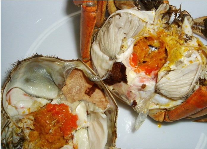 阳澄湖大闸蟹,江苏省苏州市特产,中国国家地理标志产品。阳澄湖大闸蟹又名金爪蟹。产于苏州阳澄湖。蟹身不沾泥,俗称清水大闸蟹,体大膘肥,青壳白肚,金爪黄毛,肉质膏腻。农历9月的雌蟹、10月的雄蟹,性腺发育最佳。煮熟凝结,雌者成金黄色,雄者如白玉状,滋味鲜美。